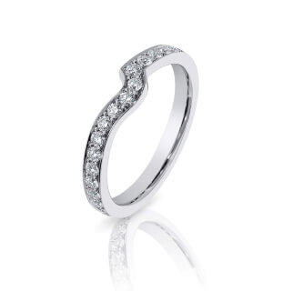 Pick the style of wedding ring. Wedding rings range from simple round bands to those with bevels and facets for added visual interest, as well as shaped rings, called contoured wedding bands, that follow the curves of your engagement ring and sit flush beside it. Some engagement rings do not require a contoured band for the two rings to sit side by side. We call these ‘wed fit’ or ‘wedding band friendly’ rings, with most of our halo engagement rings falling in this category. However, if you have a non ‘wed-fit’ engagement ring, there are many options for bespoke contoured wedding rings to explore. For example, pinch and wishbone contours are great for solitaire rings with a pronounced bezel, whereas wave contours are designed to follow the shape of the three stones in a trilogy ring. We also have our tailored contoured wedding rings, which are meticulously handcrafted to sit flush with more unusual or custom engagement rings.